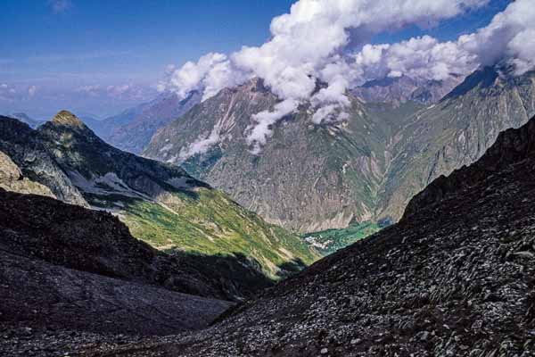Le GR suit le fond de vallée jusqu'à Villar-Loubière mais je le quitte à la Chapelle-en-Valgaudemar pour une variante plus intéressante. Le sentier grimpe le long de la cascade de Combefroide, laisse à droite l'embranchement du refuge de l'Olan et monte au col de Colombes. Il contourne ensuite le lac Lautier, franchit le col des Clochettes et descend sur le refuge des Souffles. Ce dernier est minuscule mais très bien aménagé. Pierre, le gardien, vous y accueille chaleureusement et vous pourrez peut-être faire une partie de pétanque avec lui. Le refuge a été reconstruit et le gardien changé.