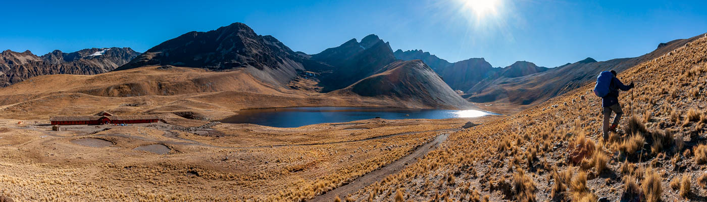 Nous faisons route à travers l'Altiplano, apercevant au loin le Condoriri au pied duquel passera bientôt le trek. Le bus nous laisse près du lac Ajwañi, à 4600 m, où se trouve un refuge récent mais non gardé. Une petite balade sur les hauteurs avant le coucher du soleil permet de vérifier l'adéquation de notre acclimatation.