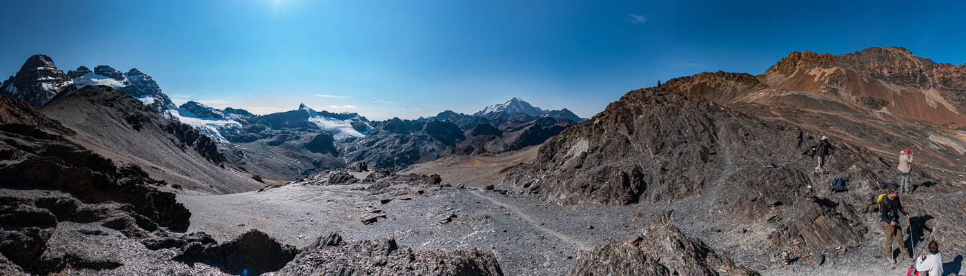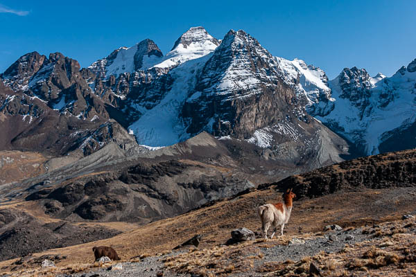 Le lendemain nous montons par une piste à un lac d'où on découvre l'impressionnante face sud du Tiquimani. Après le pique-nique près d'un autre lac nous descendons camper à Choro Tiquimani, 4000 m.