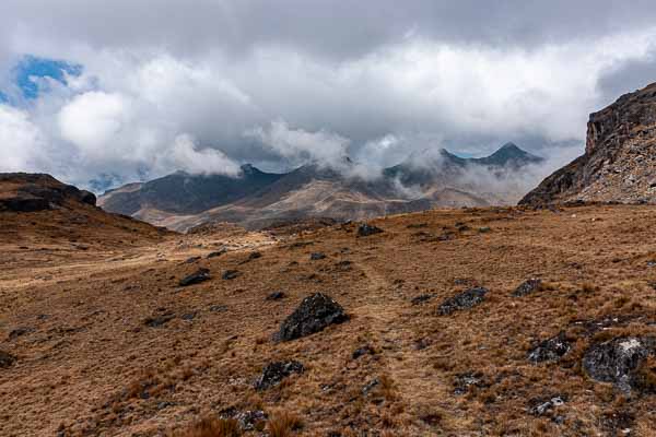 Le trek s'élève ensuite en gradins vers un col à 4700 m. Les nuages nous y rejoignent.