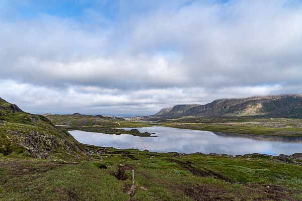 Au-dessus de la ville, après le parc à chiens, s'étend la vallée de l'Alanngorsuaq où commence l'Arctic Circle Trail, itinéraire de randonnée qui rejoint Kangerlussuaq, 160 km plus à l'est. Je le suis quelque temps puis bifurque vers un col sous le Nasaasaaq, sommet tutélaire de la localité.
