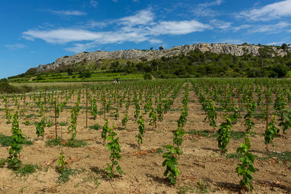 Au lieu-dit Le Pas du Loup le sentier descend une petite falaise puis traverse le vignoble du village de Roquefort-des-Corbières. Il y a une épicerie mais malheureusement l'unique bar a fermé depuis longtemps.