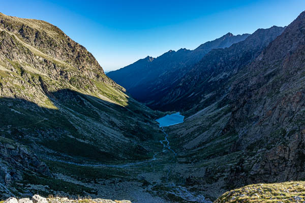 Dès que j'atteins le lac Glacé il me faut monter vers le nord-ouest pour contourner le petit lac rond du Col d'où je parviens tranquillement au col des Gentianes. La vue sur le massif du Vignemale et le glacier d'Ossoue est incomparable.