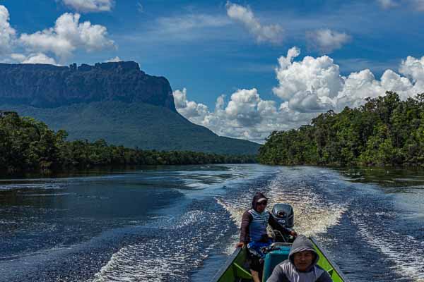 avion à Ciudad Bolívar. Les embarcations remontent le rio Carrao puis le rio Churun, alternant étendues d'eau calme et rapides. À Mayupa il faut même débarquer pour laisser la pirogue franchir à vide un passage dangereux.
