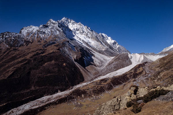 belles vues sur la chaîne frontière et les immenses glaciers qui en descendent. Nous arrivons à Bimtang, 3720 m, en début d'après-midi. Il y a quelques lodges où nous allons nous réchauffer et fêter le passage du col avec les sherpas autour d'un verre de chang.