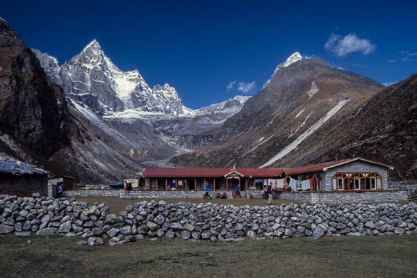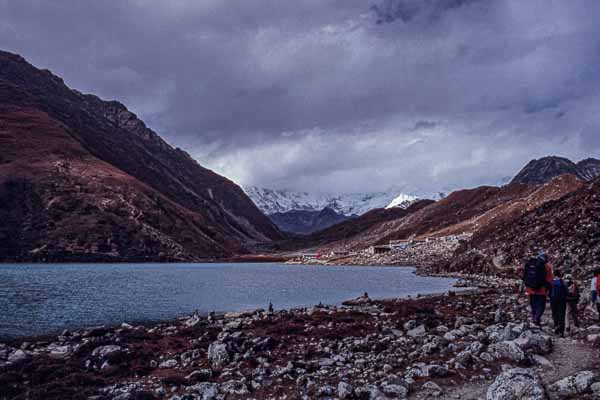 Les enclos des yaks sont déserts en cette saison, au bout de la vallée nous apercevons le Cho Oyu, 8201 m, qui est sur la frontière tibétaine. Vers le soir le temps se couvre à nouveau alors que nous atteignons le lac de Gokyo, 4750 m, près duquel se trouve notre lodge. Nous nous entassons autour du poêle dans lequel brûlent des bouses de yak, seul combustible naturel dans ces parages.