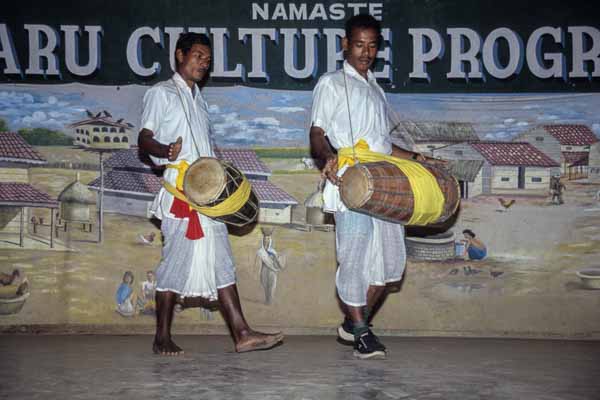 Après dîner nous allons au village assister à un spectacle culturel donné par les jeunes de l'ethnie locale, les Tharus. Ce sont des danses exécutées uniquement par des hommes au son de tambours. Le clou du spectacle est la danse du paon où le danseur me fait regretter de ne pas avoir de caméra.